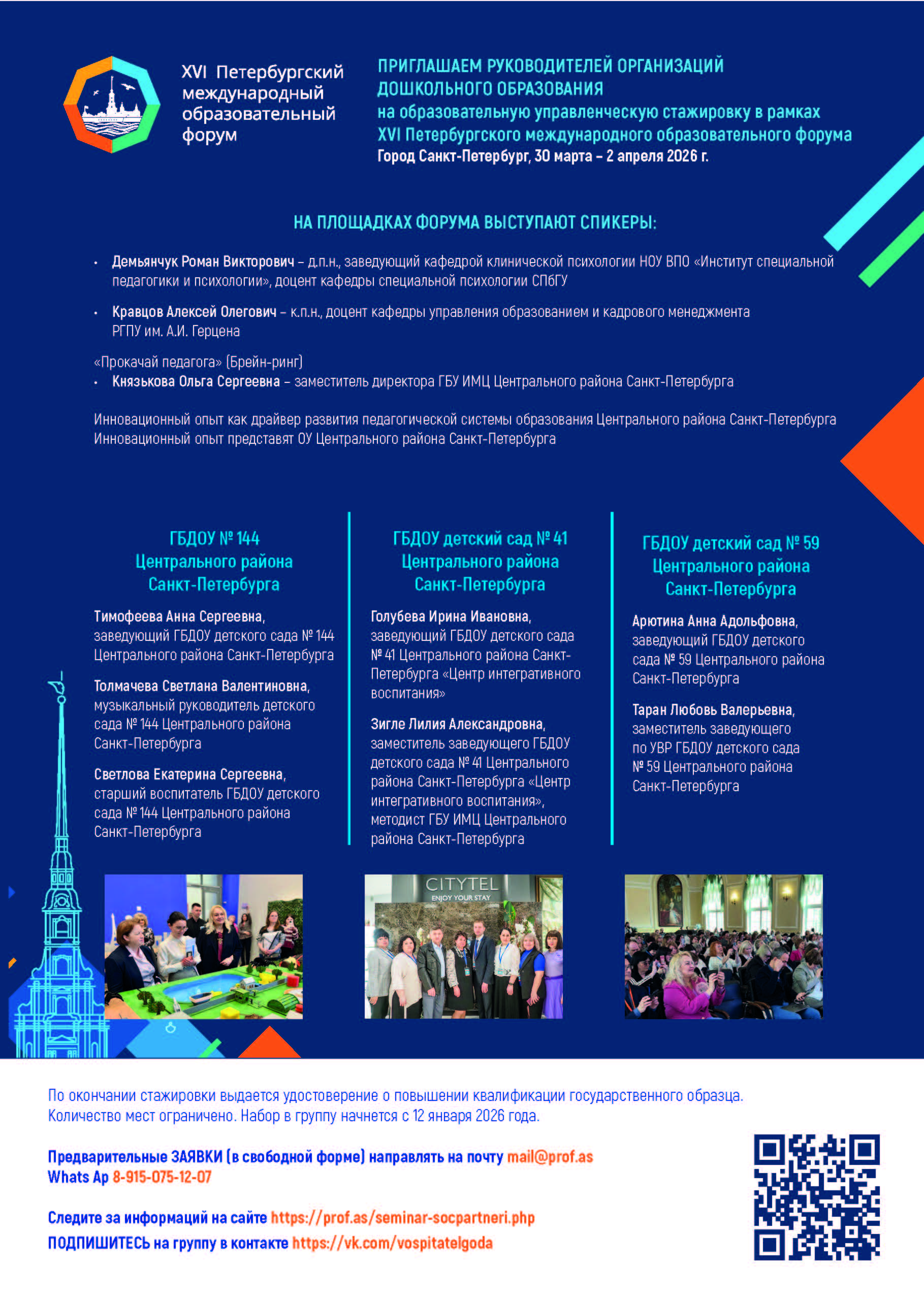 Семинар-совещание социальных партнеров- представителей органов исполнительной власти субъектов РФ и руководителей органов местного самоуправления, осуществляющих управление в сфере образования, руководителей организаций общего, дошкольного образования и руководителей профессиональных образовательных организаций (СПО); образовательная управленческая стажировка (в рамках XVI Петербургского международного образовательного форума) г. Санкт-Петербург